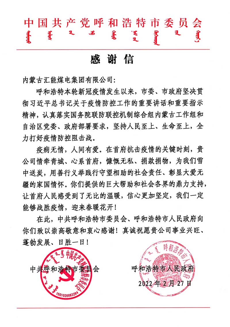 一封來自中共呼和浩特市委員會(huì)、呼和浩特市人民政府的感謝信