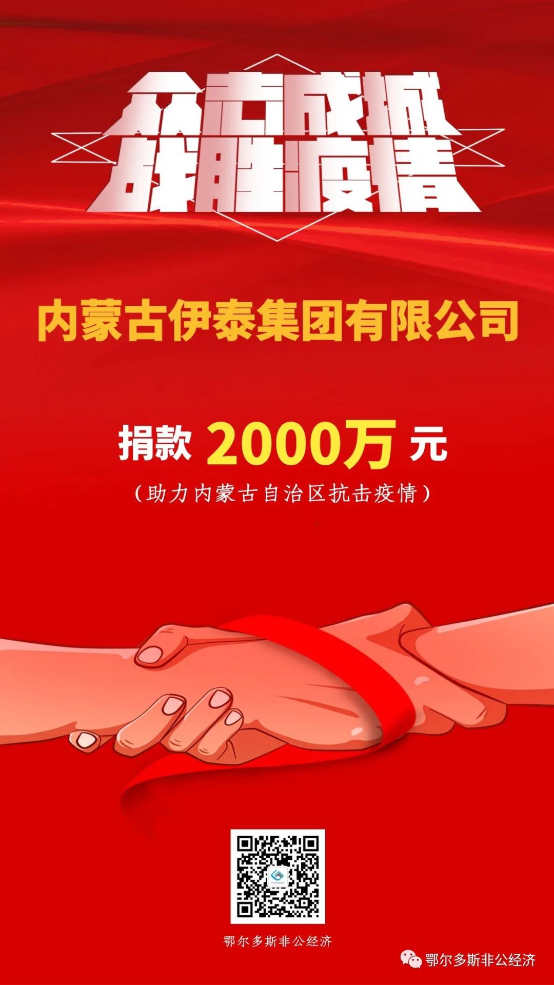 疫情發(fā)生后,我市多家民營(yíng)企業(yè)聞令而動(dòng),通過(guò)捐資捐物全力配合支援呼和浩特市、包頭市打贏疫情防控阻擊戰(zhàn),匯聚起眾志成城、萬(wàn)眾一心的強(qiáng)大力量。其中,匯能集團(tuán)捐款3000萬(wàn)元、伊泰集團(tuán)捐款2000萬(wàn)元、滿世集團(tuán)捐款1500萬(wàn)元、烏蘭集團(tuán)捐款1000萬(wàn)元、蒙泰集團(tuán)捐款1000萬(wàn)元。民營(yíng)企業(yè)以實(shí)際行動(dòng)書寫熱愛(ài)祖國(guó)、奉獻(xiàn)社會(huì)、建設(shè)家鄉(xiāng)的家國(guó)情懷,彰顯了鄂爾多斯市本土民營(yíng)企業(yè)的社會(huì)責(zé)任與擔(dān)當(dāng),為堅(jiān)決打贏疫情防控阻擊戰(zhàn)貢獻(xiàn)了力量。